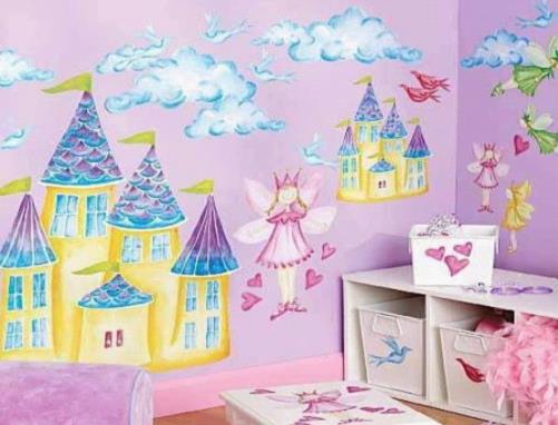 有着梦幻色彩的宫殿和蝴蝶仙子的图案,搭配亮丽的缤纷颜色,这样的壁饰深受着孩子们的喜爱。小公主们最喜欢美丽的仙子,紫色的仙子充满了神秘感、粉色的仙子有着浪漫感、而黄色的仙子则是温馨感。这样一款壁饰,很适合公主房。要是你家里是个女儿,这样的手绘墙画一定能让她开心的,带给她童话般的世界。