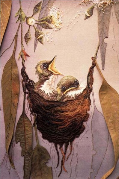 她利用各种不起眼的材料来创作,如:丝,毛,皮,棉,人造材料等。经过仔细地筛选它们的颜色,质地,可靠性和艺术感染力,这些织物被小心地上色,缝制,于是忠实地再现出她想要表现的主题,并突出了织品创作独特的质感。