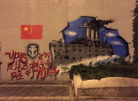 立体的视觉感受,给人们强烈的视觉冲击的同时,作者将涂鸦与反法西斯胜利70周年完美的结合在了一起,使涂鸦的性质从美观的艺术品成了抒发自身爱国情怀的表达方式。