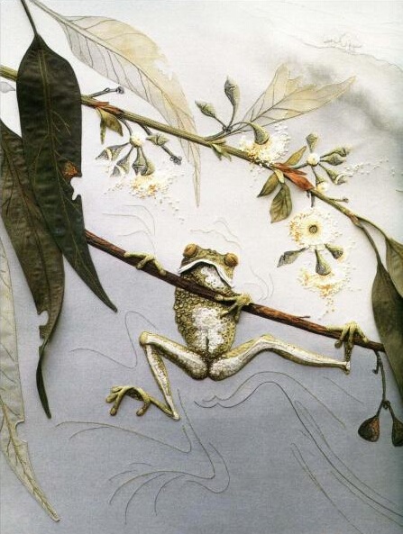 她利用各种不起眼的材料来创作,如:丝,毛,皮,棉,人造材料等。经过仔细地筛选它们的颜色,质地,可靠性和艺术感染力,这些织物被小心地上色,缝制,于是忠实地再现出她想要表现的主题,并突出了织品创作独特的质感。